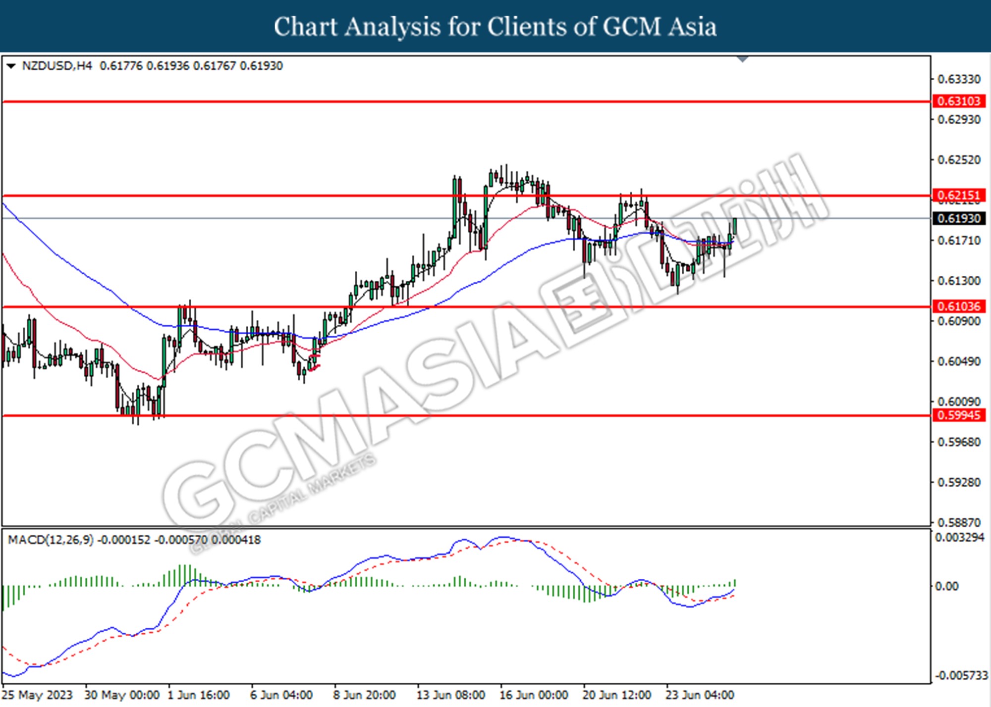 NZDUSD, H4: NZDUSD was traded higher following the prior rebound from the lower level. MACD which illustrated diminishing bearish momentum suggests the pair extended its gains toward the resistance level at 0.6215.