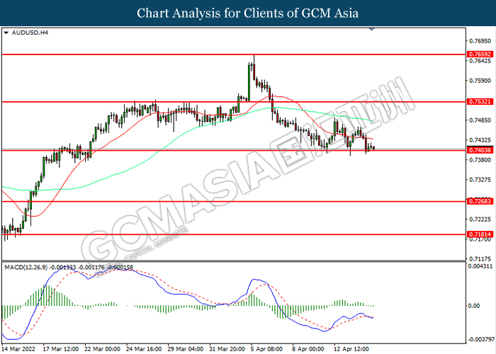 AUDUSD, H4: AUDUSD was traded lower while currently testing the support level. MACD which illustrated increasing bearish momentum suggest the pair to extend its losses after breakout.