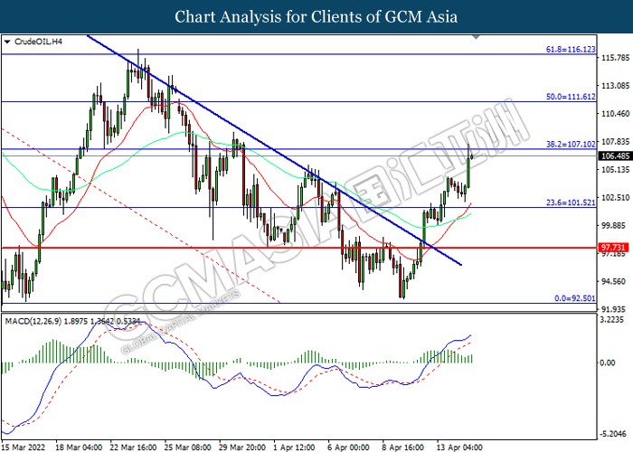 CrudeOIL, H4: Crude oil price was traded higher following prior breakout above the previous resistance level. MACD which illustrated increasing bullish momentum suggest the commodity to extend its gains.