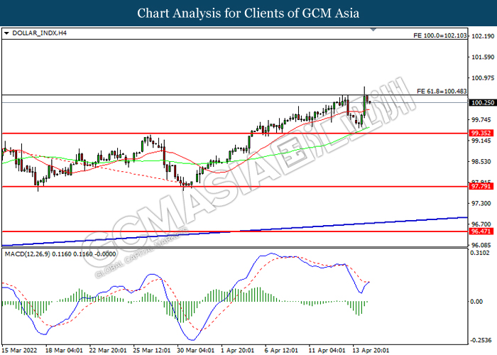 The Dollar Index which traded against a basket of six major currencies received significant bullish momentum following the US 10-year Treasury yield hit its highest level since March 2019 on Thursday as investors continued to speculated that latest hawkish tone from the Federal Reserve. The US 10-year treasury yield hitting 2.667%. According to the latest statistic, the CME FedWatch Tool was assigning a probability of 78.8% to a 50-basis point rate hike during the May FOMC meeting. In earlier, the meeting minutes released from the Fed’s March meeting suggested the Federal Reserve should reduce their liabilities in balance sheet next month while increasing the interest rate in order to combat the high inflation risk in future. As of writing, the Dollar Index appreciated by 0.15% to 99.75.