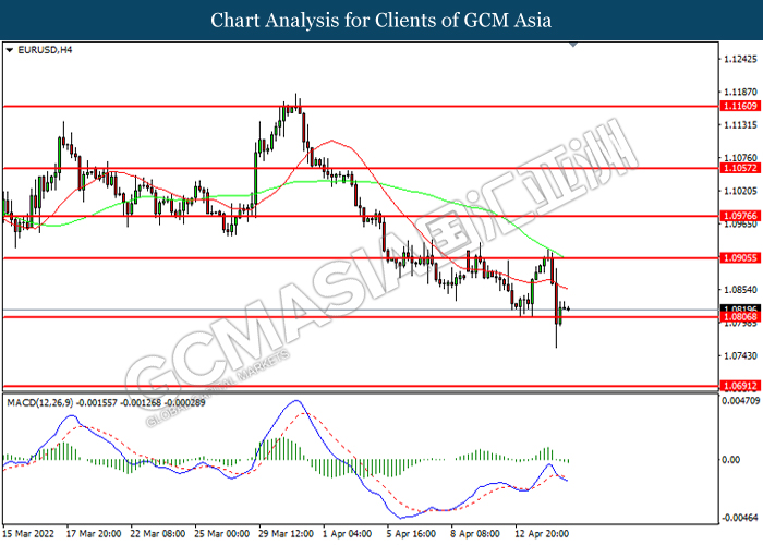EURUSD extend its losses on Friday amid the backdrop of expectations of escalation in the Ukraine crisis after Russia ceases to be a member of the United Nations (UN) Human Rights Council. According to Reuters, the members of the UN Human Rights Council voted in favor of stripping Russia from the members’ list after the Russian rebels committed war crimes in Bucha, Ukraine. As world nations are isolating Russia from major communities, Russian leader Vladimir Putin could de-escalate progress talks with Ukraine, and the Ukraine crisis may continue to elevate further. The move of Russia would likely to cause another aggressive sanctions on it. It would likely to bring negative prospects toward economic progression in Europe region as Russia was one of the trading partner for Europe, dialing down the market optimism toward Euro. It prompted investors to selloff Euro and shift their capital toward the currencies which having better prospects such as US Dollar. As of writing, EURUSD depreciated by 0.18% to 1.0858.