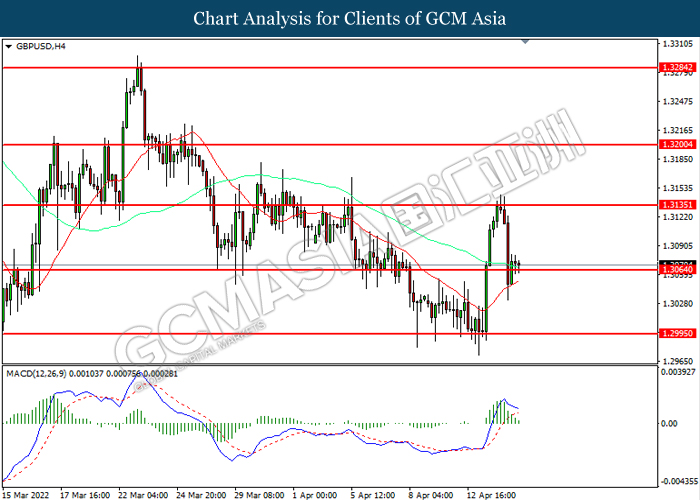 GBPUSD, H4: GBPUSD was traded lower following prior breakout below the previous support level. MACD which illustrated decreasing bullish momentum suggest the pair to extend its losses.