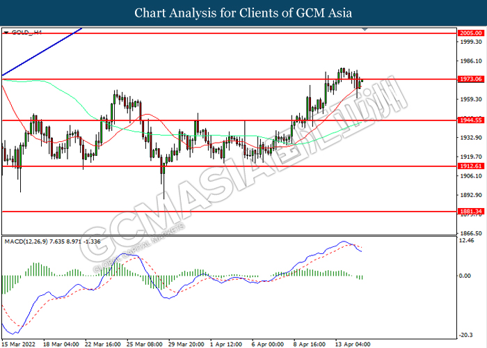GOLD_, H4: Gold price was traded lower while currently testing the support level. MACD which illustrated decreasing bullish momentum suggest the commodity to extend its losses if successfully breakout the support level.