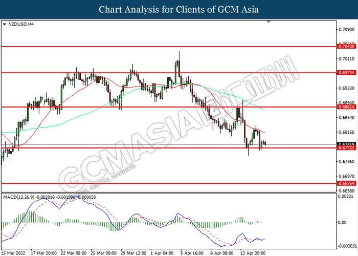 NZDUSD, H4: NZDUSD was traded lower following while currently testing the support level. MACD which illustrated increasing bearish momentum suggest the pair to extend its losses id successfully breakout the support level.
