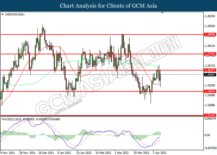 USDCAD slumped from its recent high since Wednesday following the rate hike from Bank of Canada (BoC). According to Bank of Canada statement, Canada Interest Rate notched up from the previous reading of 0.50% to 1.00%, which fulfilled the market forecast of 1.00%. The Quantitative Tightening would begin on April 25. Besides, the BoC Governing Council judges that rates need to rise further and emphasizes that interest rates would be the bank’s primary tool for setting monetary policy. The BoC reiterated that they would guide the timing and pace of further rate hikes, as the BoC remains committed to achieving the 2% inflation target. The war-driven inflation risk had led to the spike of commodities price such as crude oil. Thus, BoC decided to increase interest rate in order to combat inflation risk by diminishing money circulation in the market. Rate hike from BoC would likely to bring positive prospects toward Canadian Dollar, prompting investors to shift their capitals towards Canadian Dollar. Investors would continue to scrutinize the latest updates with regards of interest rate decision from BoC in order to gauge the likelihood movement of the pair. As of writing, USDCAD depreciated by 0.13% to 1.2550.