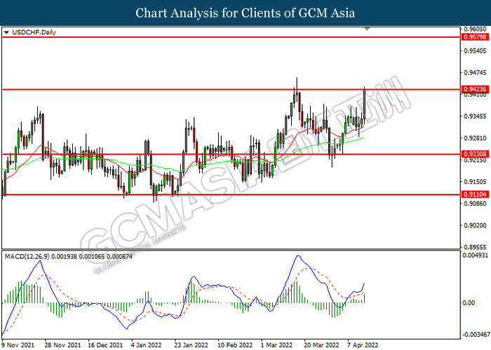 USDCHF, H4: USDCHF was traded higher following prior breakout above the previous resistance level. MACD which illustrated increasing bullish momentum suggest the pair to extend its gains.