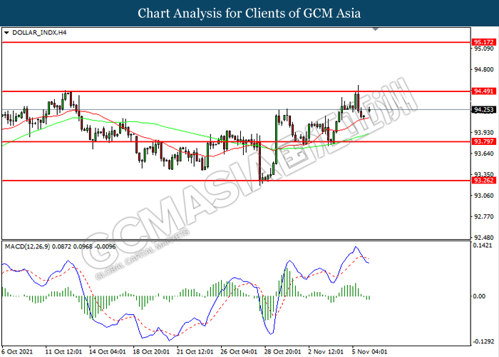 The Dollar Index which traded against a basket of six major currency pairs retrace from its highest level in more than a year despite bullish economic data amid market participants remained concerns over the inflation risk in future, which diminishing the appeal for the US Dollar. In earlier, the Federal Reserve had announced to taper the bond buying program later this month, but it stuck to its long-held view that the surge in inflation is only transitory while maintaining their interest rate at nearly 0%. On the economic data front, most of the crucial economic data from US last week had fared better-than-expectation, which limiting the losses experienced by the US Dollar. According to Bureau of Labor Statistics, U.S. Nonfarm Payrolls notched up significantly from the previous reading of 312K to 531K, exceeding the market forecast at 450K. Meanwhile, U.S. Unemployment rate came in at 4.6%, which also better than the market expectation at 4.7%. As of writing, the Dollar Index depreciated by 0.09% to 94.25.