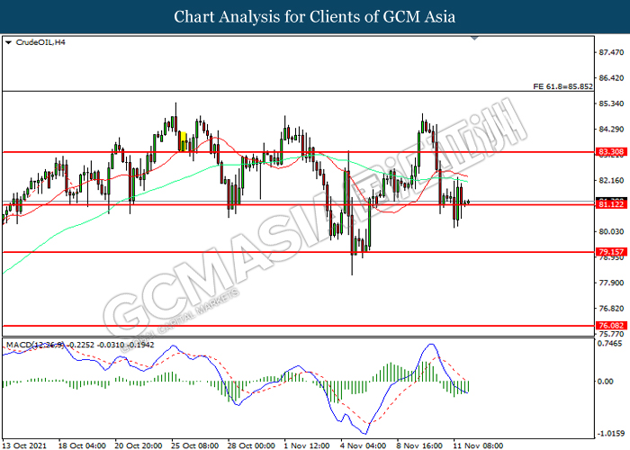 CrudeOIL, H4: Crude oil price was traded higher following prior breakout above the previous resistance level at 81.50. However, MACD which illustrated diminishing bullish momentum suggest the commodity be traded lower in short-term as technical correction.