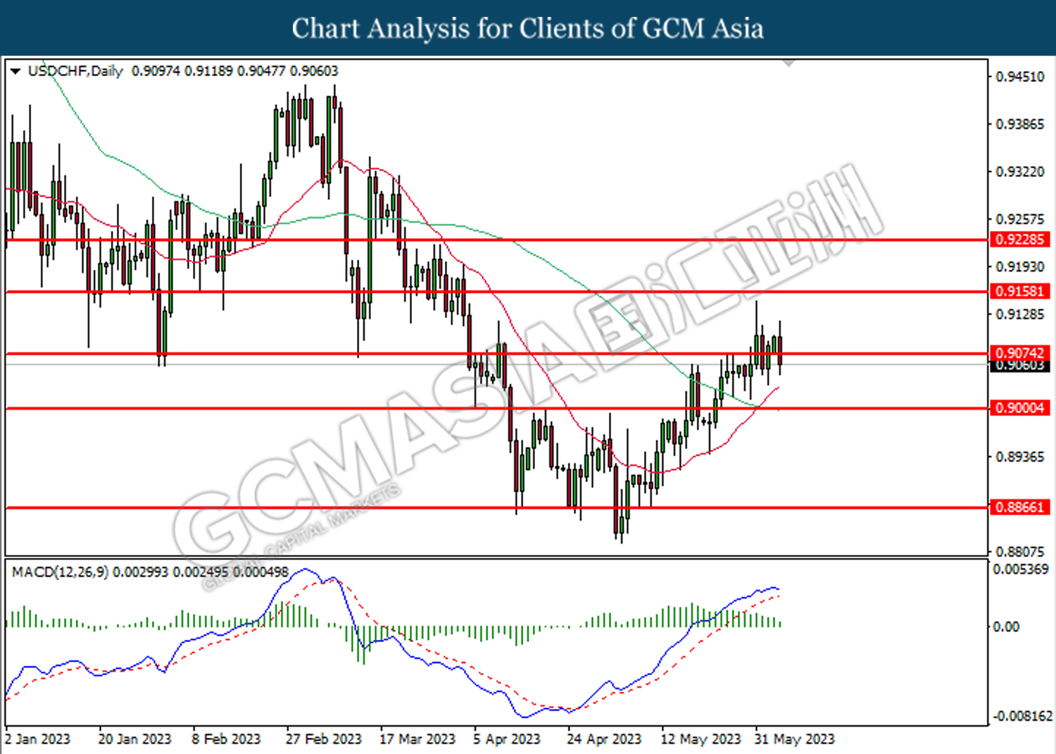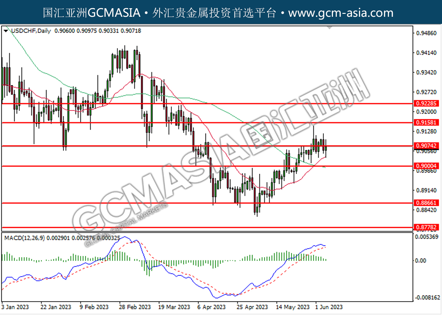 USDCHF, DAILY: USDCHF was traded higher following the prior rebound from the lower level. However, MACD which illustrated increasing bearish momentum suggests the pair undergoes a technical correction in the short term.