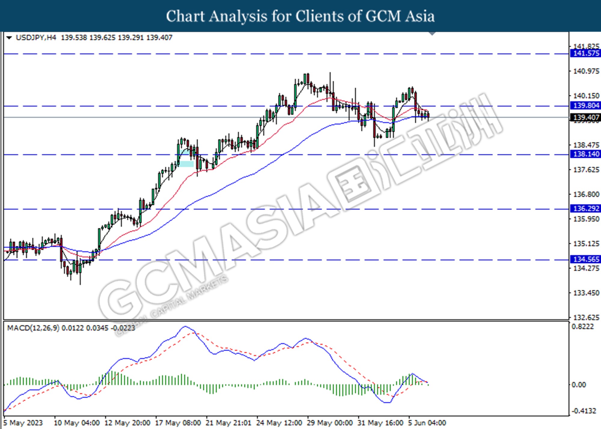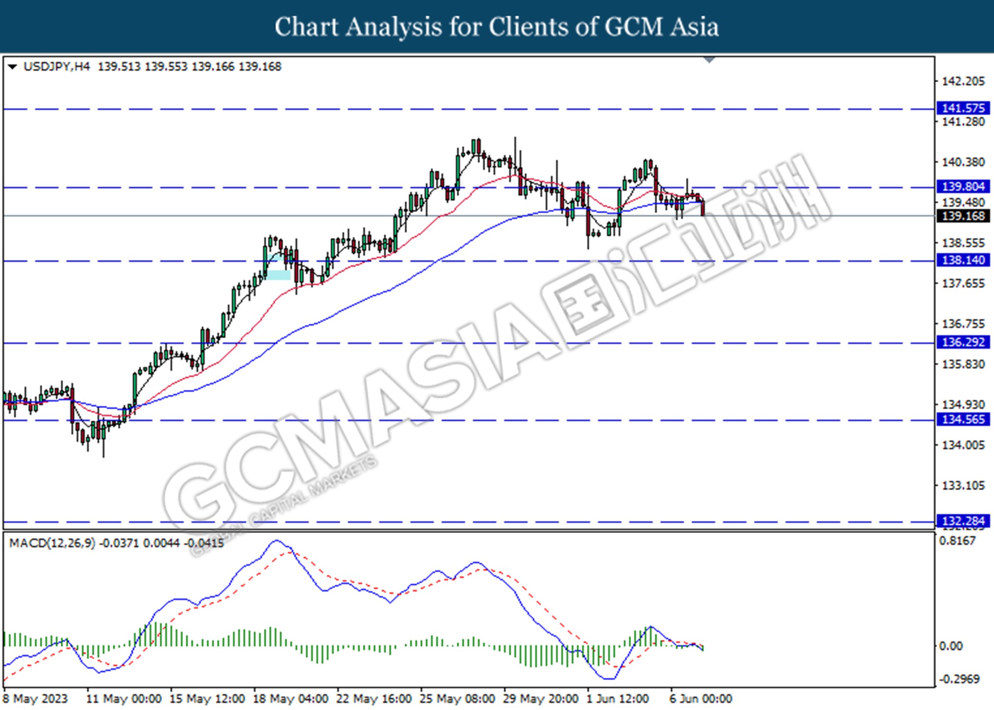 USDJPY, H4: USDJPY was traded lower following the prior breaks below the previous support level at 139.80. MACD which illustrated bearish momentum suggests the pair extended its losses toward the support level.