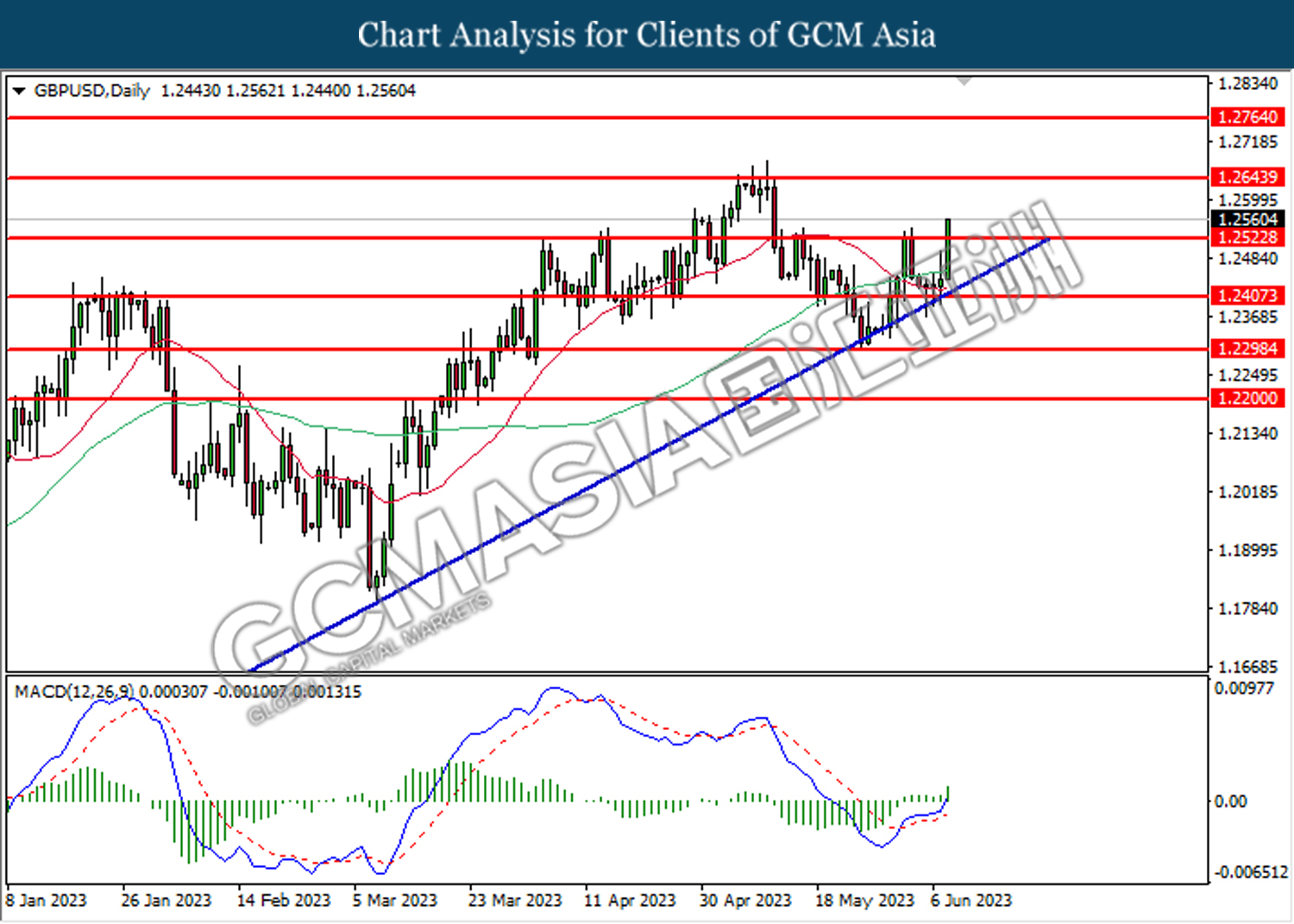 GBPUSD, DAILY: GBPUSD was traded higher following the prior breaks above the previous resistance level at 1.2565. MACD which illustrated increasing bullish momentum suggests the pair to extend its gains toward the resistance level.