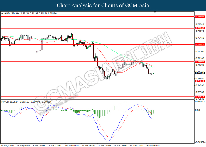 AUDUSD, H4: AUDUSD was traded lower while currently testing the support level at 0.7465. However, MACD which illustrated diminishing bearish momentum suggest the pair to extend its losses after it successfully breakout below the support level.