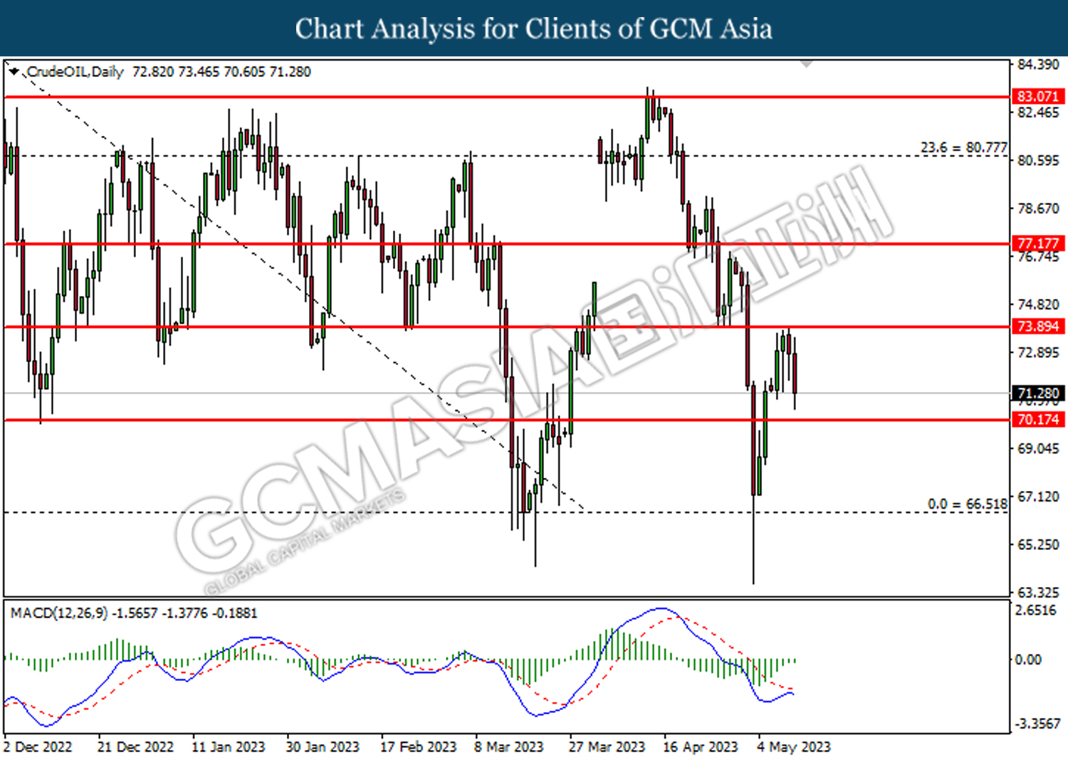 CrudeOIL, Daily: Crude oil price was traded lower following the prior retracement from the resistance level at 73.90. MACD which illustrated diminishing bearish momentum suggest the commodity to undergo technical correction in short term.