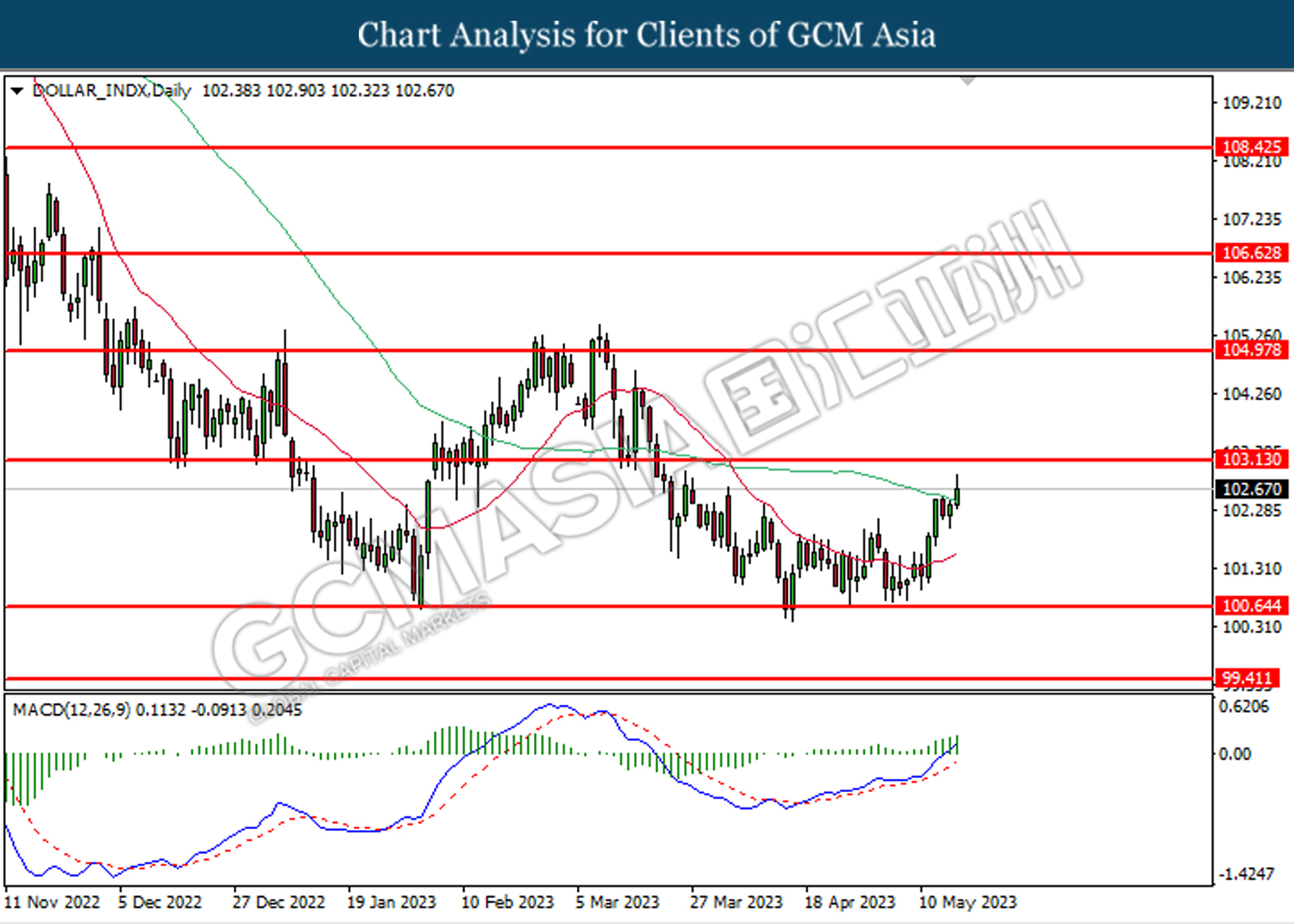 DOLLAR_INDX, Daily: Dollar index was traded higher while currently testing the resistance level at 103.15. MACD which illustrated bullish bias momentum suggests the index to extend its gains after it successfully breakout above the resistance level.