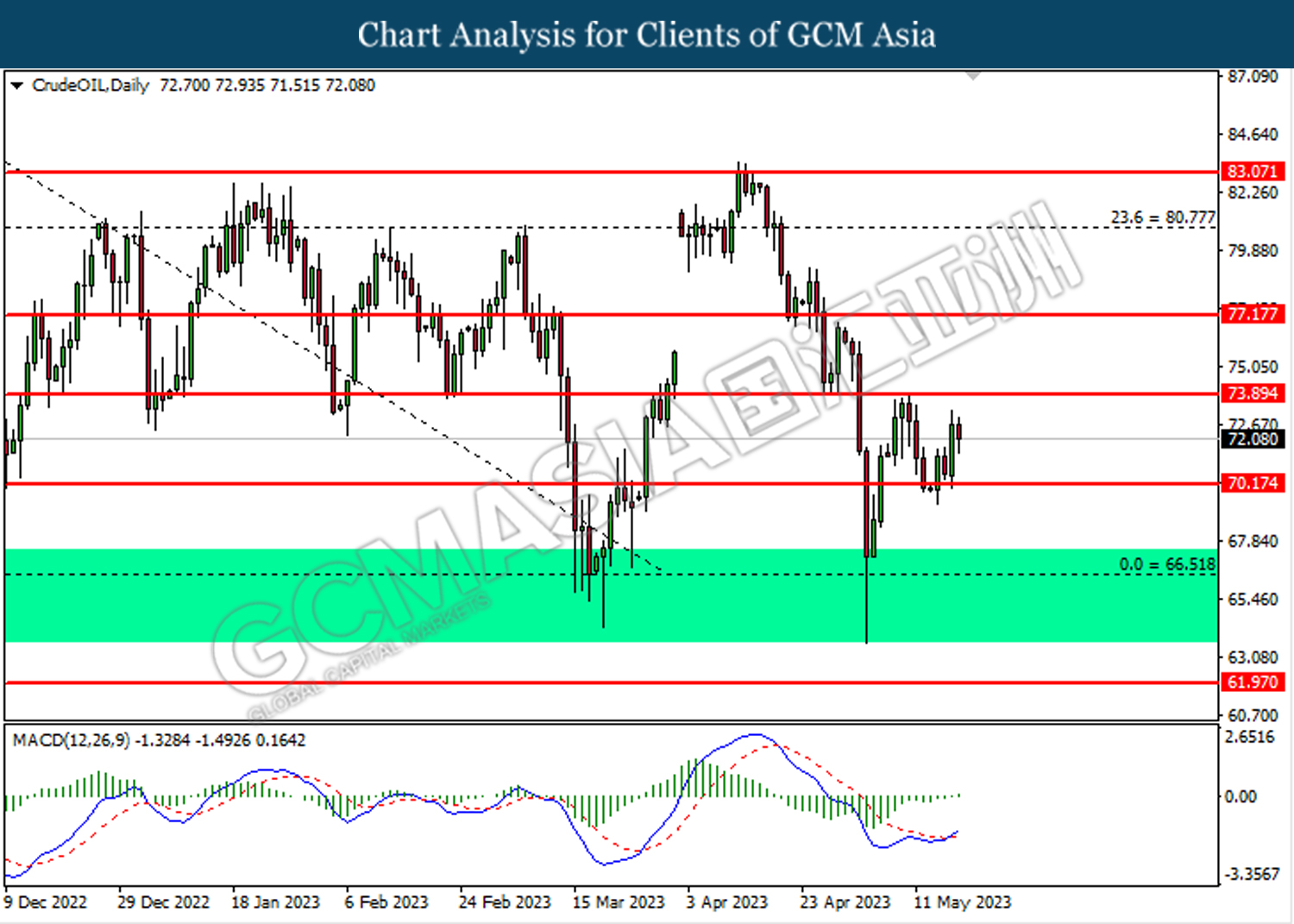 CrudeOIL, Daily: Crude oil price was traded higher following the prior rebound from the support level at 70.15. MACD which illustrated diminishing bearish momentum suggest the commodity to extend its gains toward the resistance level at 73.90.