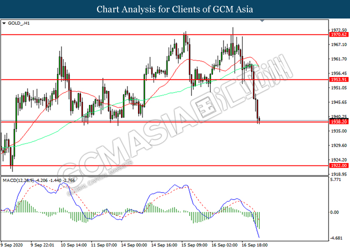 GOLD_, H1: Gold price was traded lower while currently testing the support level at 1937.75. MACD which illustrated increasing bearish momentum suggest the commodity to extend its losses after it successfully breakout below the support level.