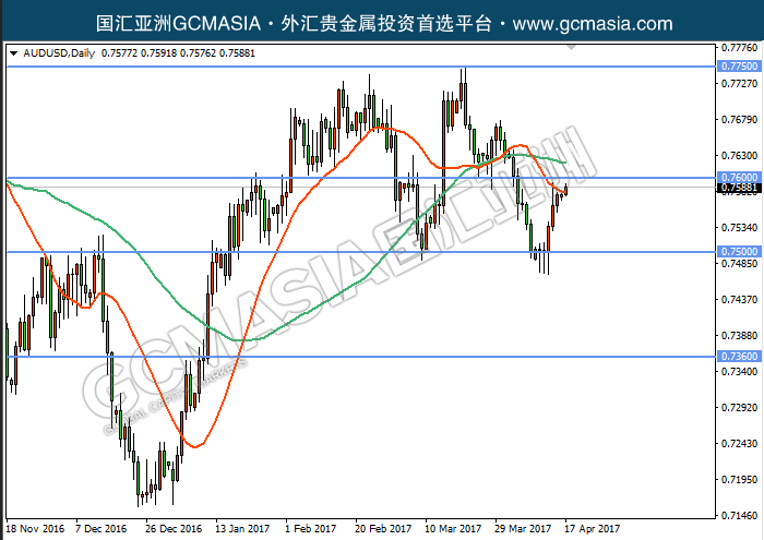 AUDUSD D1澳美高位宽幅震荡,当前触及低位支撑反弹;均线趋缓,低位买盘较强,倘若上破高位阻力,可保持看多。上方关注0.7600压力和0.7750压力,下方关注0.7500支撐和0.7360支撑。