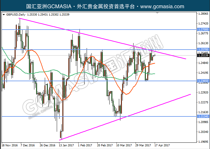 GBPUSD D1镑美三角形震荡收敛,当前测试三角形顶部阻力,关注突破;均线趋缓,震荡偏强,倘若上破阻力位,可保持看多。上方关注1.2570压力和1.2700压力,下方关注1.2365支撑和1.2134支撑。