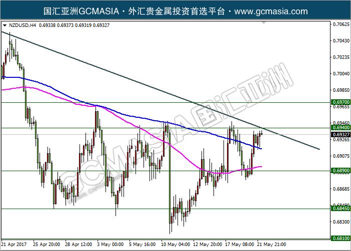 NZDUSD H4:纽美低位盘整,震荡偏强,均线拐向收敛,多空胶着;目前测试趋势线阻力,若上破或有较大回调,短期建议关注空头回调;上方关注0.6940阻力和0.6970阻力;下方关注0.6890支撑和0.6845支撑。