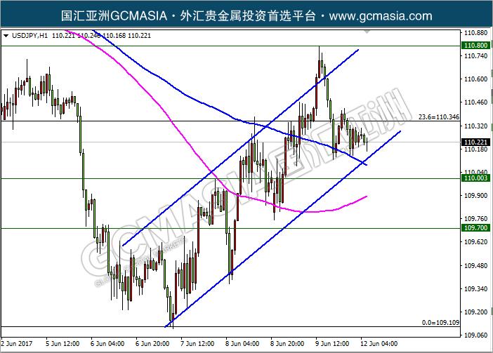 USDJPY H1:美日低位回调上行,运行上行通道;低位存在均线支撑,测试通道底部若企稳,或继续多头回调;上方关注110.35阻力和110.80阻力;下方关注110支撑和109.7支撑。