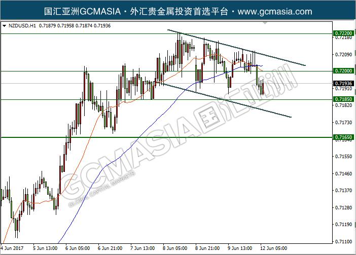 NZDUSD H1:纽美高位回落,震荡回调,空头转强;目前回测整点阻力,若继续承压,仍有下行空间,关注高位下行通道趋势,关注空头回调;上方关注0.7200阻力和0.7220阻力;下方关注0.7185支撑和0.7165支撑。