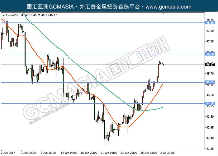 CrudeOIL H4: 美式原油处于上行趋势,震荡上行,上测试前高位阻力;均线张口扩大,低位买盘偏强,仍有上行空间,后市保持以看空为主。上方关注46.70压力和48.30压力,下方关注45.25支撑和44.15支撑。