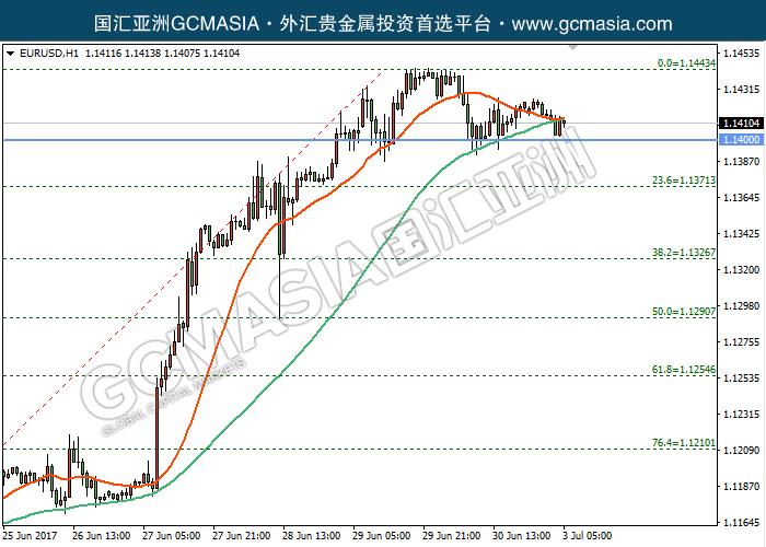 EURUSD H1:欧美处于高位盘整,当前测试低位支撑,等待突破;均线拐向收敛,震荡偏弱,后市突破下行几率偏大。上方关注1.1445压力,下方关注1.1400支撑和1.1370支撑。