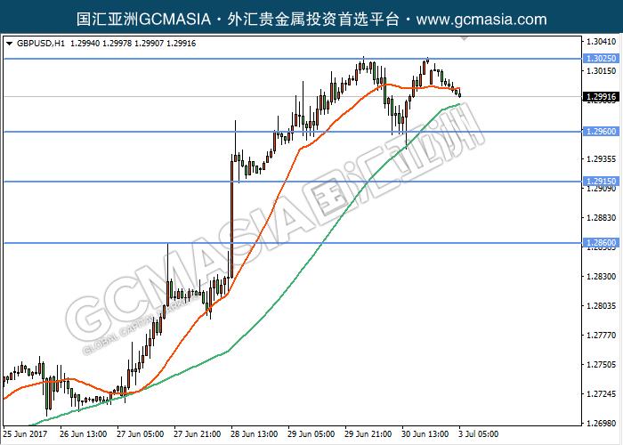 GBPUSD H1:镑美高位盘整,当前触及前高位阻力,震荡下行;均线拐向,高位卖盘震荡加剧,仍有下行空间,保持看空。上方关注1.3025压力,下方关注1.2960支撑和1.2915支撑。