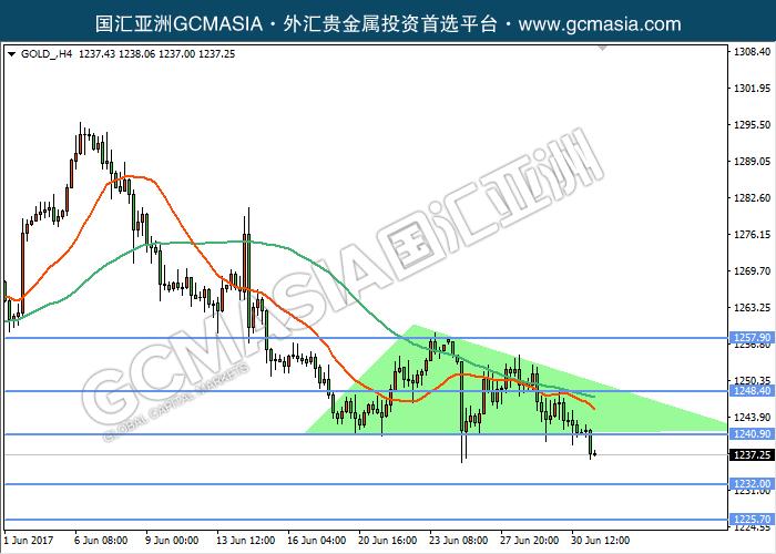 GOLD H4:黄金突破三角形底部,震荡下行;均线高位压制,卖盘震荡加剧,仍有下行空间,保持看空。上方关注1240.90压力和1248.40压力,下方关注1232支撑和1225.70支撑。