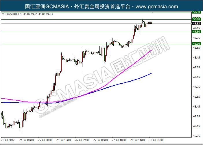 CrudeOIL H1:原油运行上行趋势,均线多头排列,多头较强;目前测试整点阻力,存在卖盘震荡加剧,短期或有一定回调,等待进一步突破;上方关注50阻力和50.3阻力;下方关注49.5支撑和49支撑。