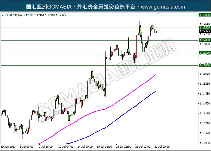 美联储上周三公布了最新的7月份利率决议,一如市场预期对货币政策暂按兵不动,立场依旧宽松,同时,上周五公布的美国GDP报告令美元再度遭受打击,美元连续三周持续下跌,在14个月低点盘整。目前美指下行低位,震荡略微回调,欧美上行高位,震荡盘整,交投于1.1730;澳美高位盘整,震荡偏强,交投于0.7980;美日下行低位,震荡偏强,交投于110.6;黄金高位回调,震荡偏弱,交投于1267.7。