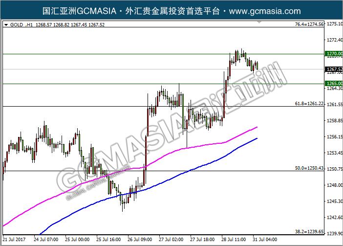 GOLD H1:黄金上行高位,震荡略微回调;目前测试整点阻力,存在一定卖盘压制,短期继续关注空头回调;上方关注1270阻力和1275阻力;下方关注1265支撑和1260支撑。