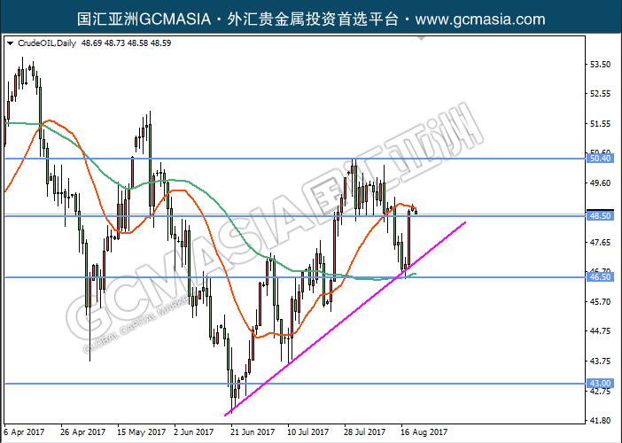 Crude_OIL D1:美式原油处于下行趋势,目前触及均线阻力回落;均线高位压制,动能转弱,短期关注回调.上方关注均线压力和50.40压力,下方关注48.50支撑和趋势线支撑.