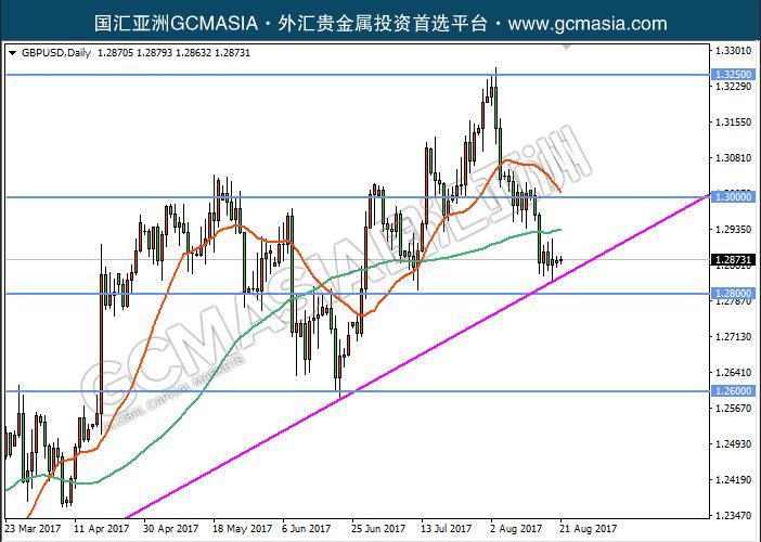 GBPUSD D1: 镑美高位回落,目前测试趋势线支撑,等待突破;均线拐向,高位买盘偏强,后市下破几率偏大.上方关注均线压力和1.3000压力,下方关注1.2800支撑和1.2600支撑.