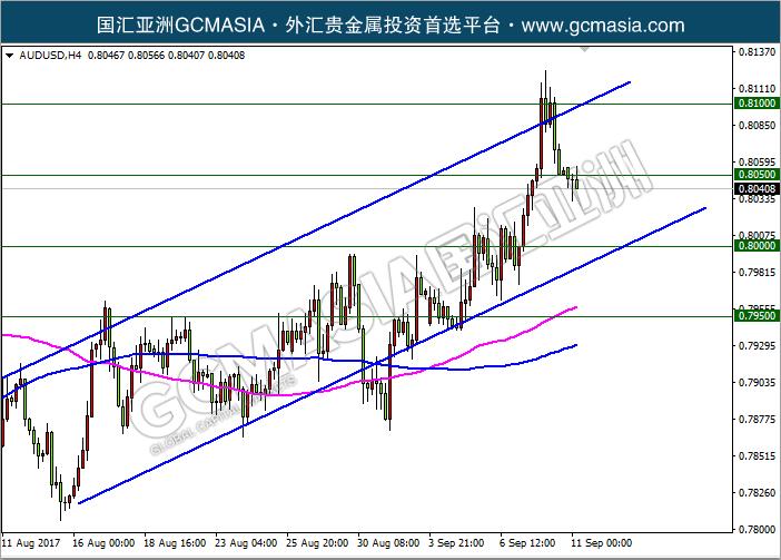 AUDUSD H4:澳美冲高回落,震荡下行,空头回调;目前测试下破整点支撑,继续下行几率略大,短期仍有下行空间,关注空头回调;上方关注0.8050阻力和0.8100阻力;下方关注0.8000支撑和0.7950支撑。