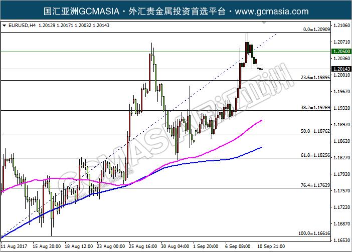 EURUSD H4:欧美冲高回落,震荡偏弱,空头回调;目前或继续回测23.6水平线支撑,关注空头回调,短期关注水平线支撑能否突破;上方关注1.2050阻力和1.2090阻力;下方关注1.1990支撑和1.1925支撑。
