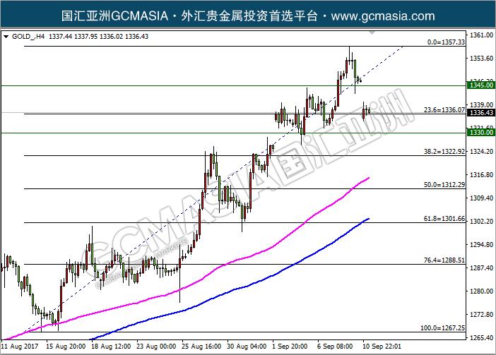 GOLD H4:黄金冲高回落,震荡下行,空头回调;目前测试下破23.6水平线支撑,若下破下行空间打开, 短期关注附近震荡,等待突破;上方关注1345阻力和1355阻力;下方关注1336支撑和1330支撑。