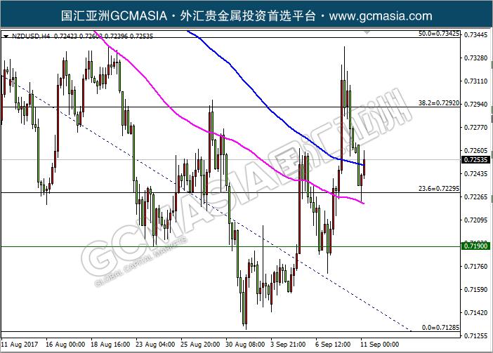 NZDUSD H4:纽美高位回调,震荡回落,测试企稳均线及23.6水平线支撑,存在一定买盘,短期关注多头回调;上方关注0.7290阻力和0.7340阻力;下方关注0.7230支撑和0.7190支撑。