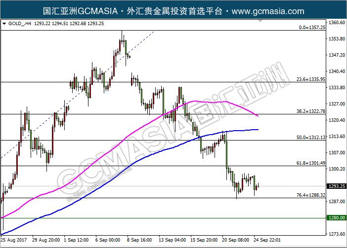 GOLD H4:黄金高位回调,震荡下行,均线拐向,空头转强;目前测试76.4水平线支撑,存在一定买盘,震荡加剧,短期关注附近震荡,等待突破;上方关注1301阻力和1312阻力;下方关注1288支撑和1280支撑。