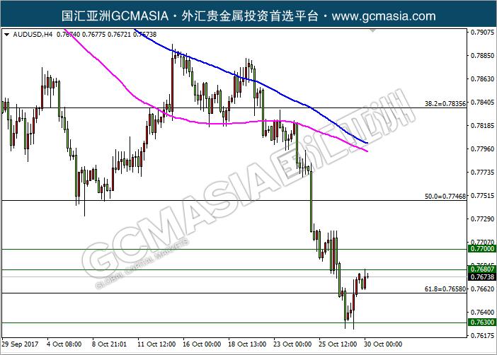 AUDUSD H4:澳美下行低位,震荡回调,均线高位空头压制;目前回测整点阻力承压,继续走弱几率较大,短期关注空头势力为主;上方关注0.7680阻力和0.7700阻力;下方关注0.7660支撑和0.7630支撑。