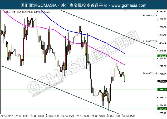 GOLD H1:黄金运行下行趋势,均线空头排列,看空为主;目前低位回调测试均线继续承压,高位存在较强阻力,短期继续关注空头势力;上方关注1271阻力和1275阻力;下方关注1268支撑和1264支撑。