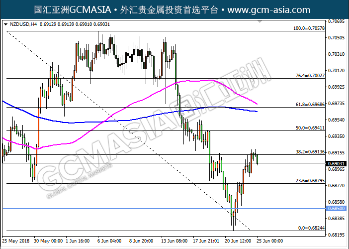 - NZDUSD H4:纽美低位反弹,震荡回调,多天转强;目前上测38.2水平线阻力,存在一定卖盘,震荡偏弱,短期关注能否上破关键阻力。上方关注0.6910压力和0.6940压力,下方关注0.6880支撑和0.6850支撑。