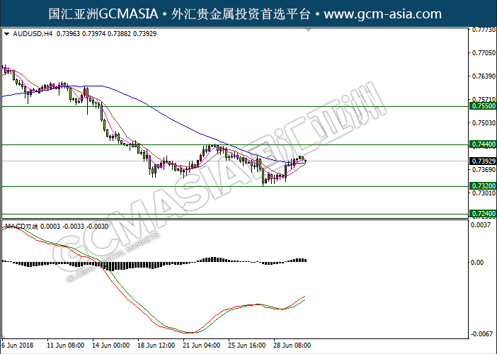 - AUDUSD H4:澳美运行下行趋势,震荡盘整。均线拐向,多头排列;目前回测前期整点阻力,任有一定的上行空间,短期关注多头势力为主。上方关注0.7440压力和0.7550压力,下方关注0.7320支撑和0.7240支撑。