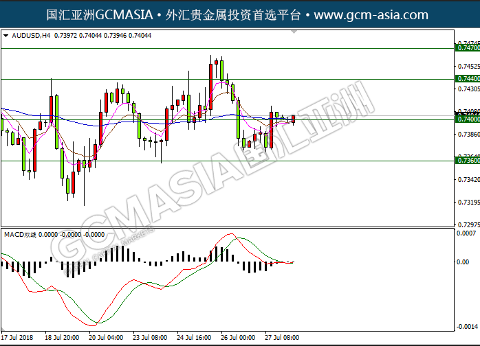 - AUDUSD H4:澳美震荡盘整,均线拐向趋缓,空头排列;目前测试下破前期的整点支撑,若下破后市仍有一定的下行空间。上方关注0.7440压力和0.7470压力,下方关注0.7400支撑和0.7360支撑。