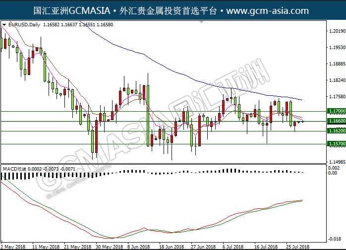 - EURUSD D1:欧美区间震荡盘,均线拐向,空头排列;目前测试前期的整点支撑。MACD动能趋缓。短期仍有一定的下行空间。上方关注1.1660的压力和1.1700的压力,下方关注1.1620的支撑和1.1570的支撑。