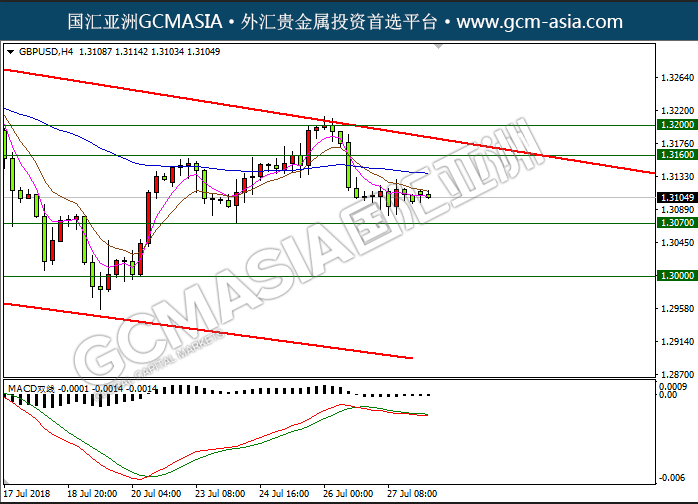 - GBPUSD H4:镑美运行下行趋势,高位回落;均线拐向,形成死叉。目前下测前期的整点支撑。MACD双线缠绕,动能趋缓,短期以顺势为主。上方关注1.3160的压力和1.3200压力,下方关注1.3070支撑和1.3000支撑。
