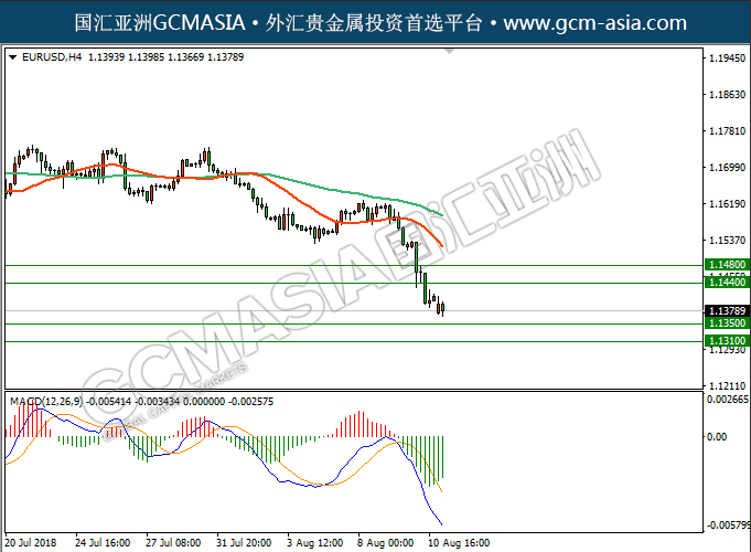 - EURUSD H4:欧美下行至低位震荡盘整,均线拐向,空头排列;目前测试下破前期的关键支撑。MACD形成死叉动能趋缓。短期关注能否承压下行。上方关注1.1480的压力和1.1440的压力,下方关注1.1350的支撑和1.1310的支撑。