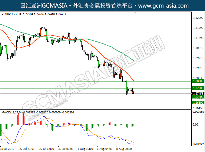 - GBPUSD H4:镑美震荡持续下行;均线拐向,空头排列。目前下测前期的整点支撑。MACD动能略减,短期关注空头趋势为主。上方关注1.2780的压力和1.2830压力,下方关注1.2720支撑和1.2680的支撑。