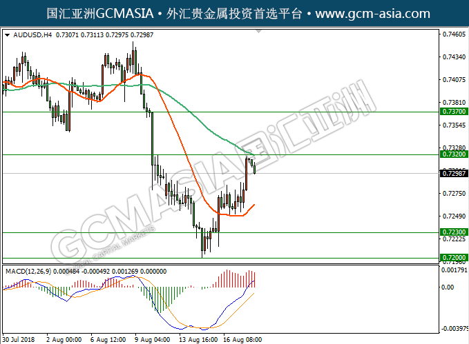 - AUDUSDH4:澳美冲高回落,MACD底部形成金叉,动能减弱。短期关注回调。上方关注0.7370压力和0.7320压力,下方关注0.7200的支撑和0.7230的支撑。