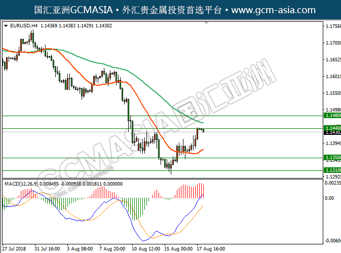 - EURUSD H4:欧美上行承压有所回落;短期关注空头趋势。MACD形成底部形成金叉,动能增强。上方关注1.1480的压力和1.1440的压力,下方关注1.1350的支撑和1.1310的支撑。